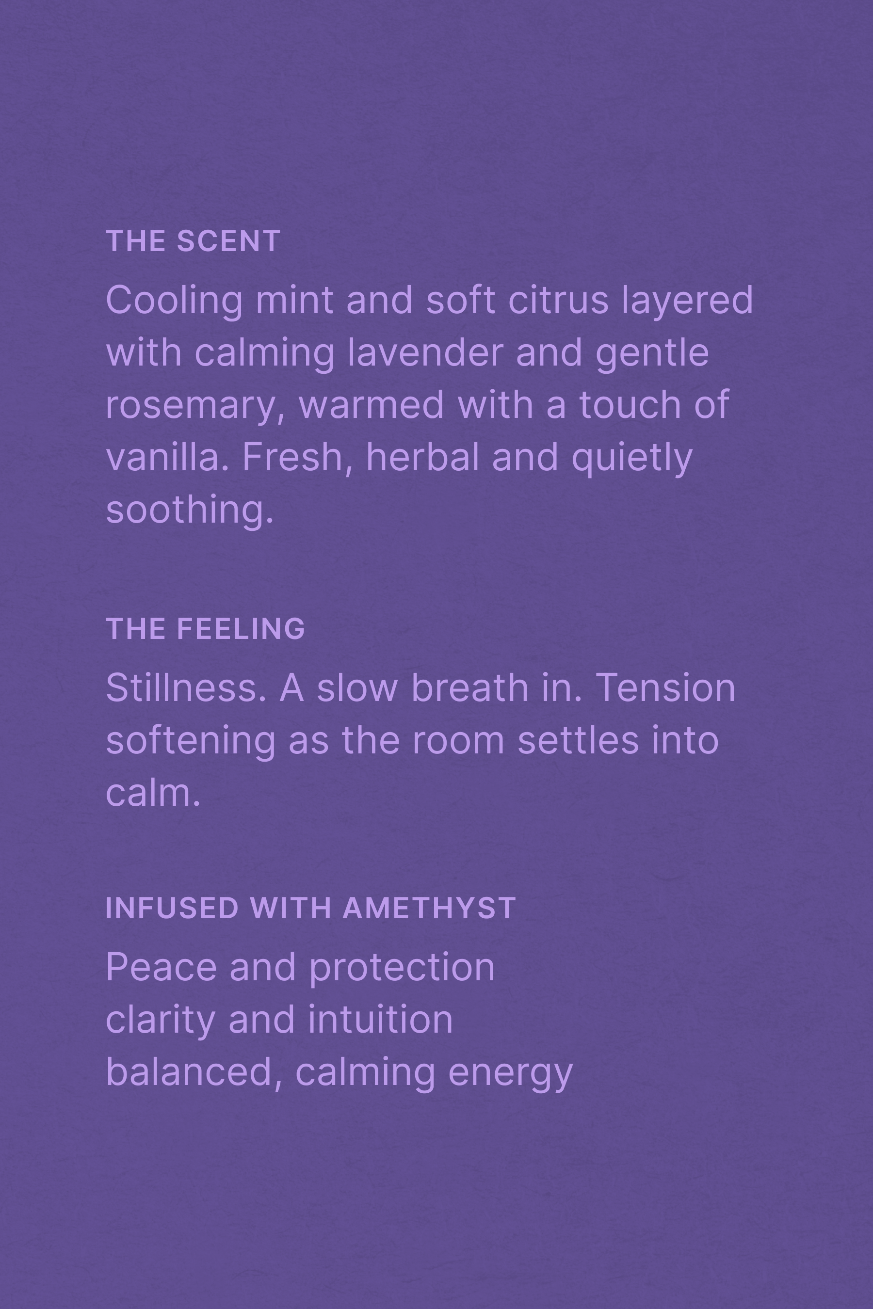 This crystal-infused candle blends soft herbal notes with the grounding energy of amethyst — designed to help you unwind, reset, and return to centre.