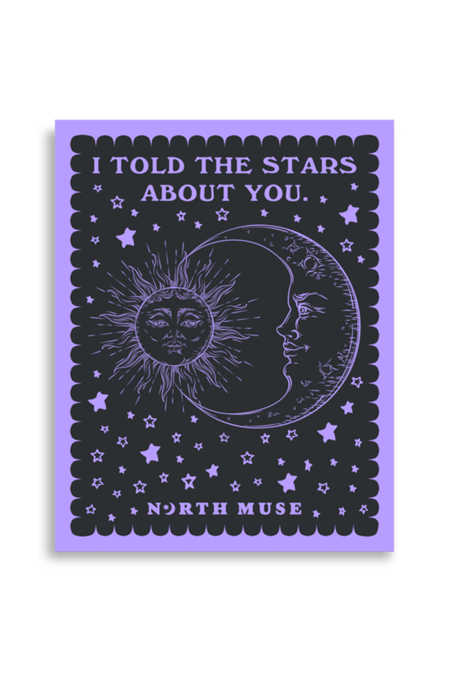 This soft and dreamy poster features a whimsical sun and moon design with a sweet message: "I Told the Stars About You." In gentle lilac and black, it's a lovely addition to any room, perfect for those who love a touch of celestial charm.