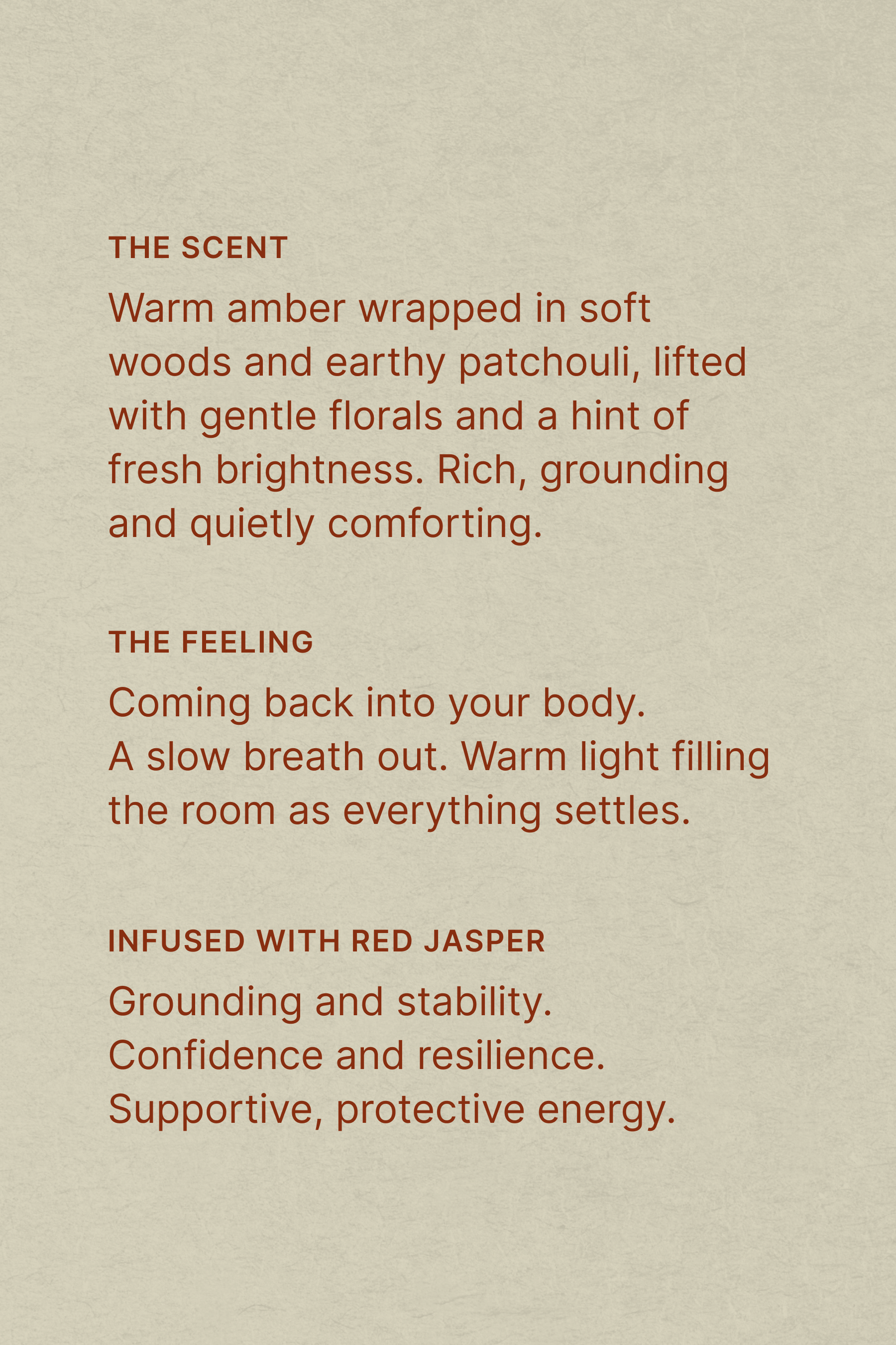 Rich patchouli and warm amber blend into a grounding, soothing scent that nurtures calm and emotional steadiness. It creates a space where you can breathe deeply, reconnect with your power and move through life with intention.