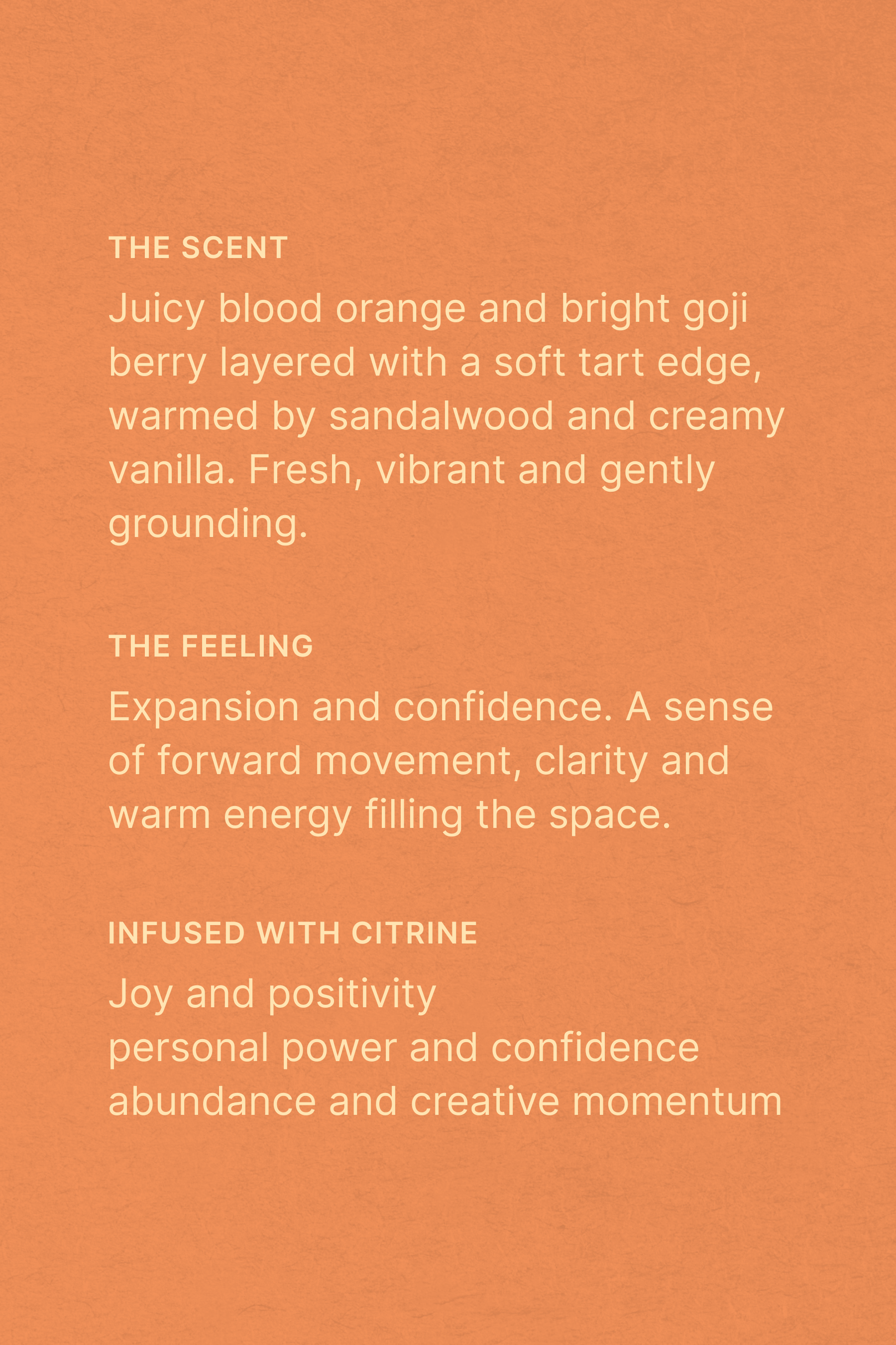 Citrus notes of blood orange and goji berry blend with warm sandalwood and creamy vanilla for a scent that feels radiant, grounding and gently energising.